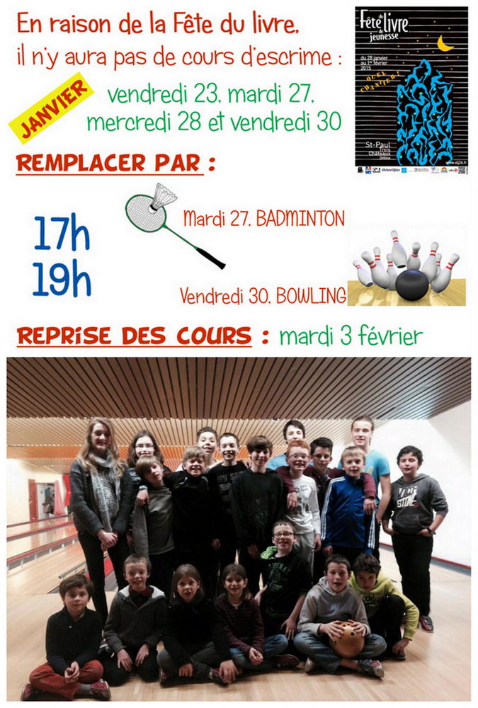 Pendant le Salon du Livre de Jeunesse, les jeunes escrimeurs ont pu participé à des activités de remplacement : Badminton le mardi et Bowling le vendredi ! |