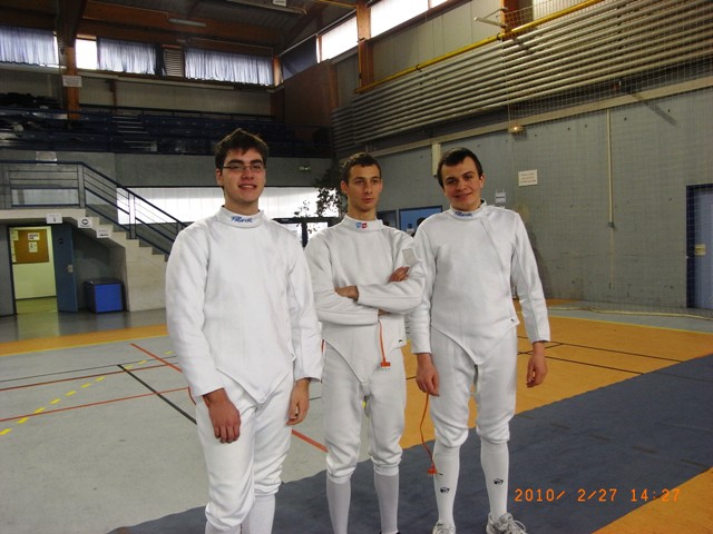 Jacques Jérôme et Jean Paul Hier, samedi à Montélimar l'équipe du Masque de Fer Tricastin composée de Jacques ALVADOS, Jean Paul BONTHOUX et Jérôme BOTTOIS disputait le championnat de zone Sud Est. premier tour contre l'équipe de Grenoble Parmentier 1 et là surprise ils gagnent sur le score très serré de 44 touches à 43. Ils rencontrent l'équipe de la principauté de Monaco et s'iclinent 45 touches à 33. En match de classement, ils gagnent deux fois et terminent à une très bonne 10ème place sur 20 équipes qualifiées pour cette compétition. TOUS LES RESULTATS Félicitations à nos trois escrimeurs et n'oublions quand même pas qu'ils combattaient contre des petits jeunes (seniors) et qu'ils sont tous les trois vétérans. Aujourd'hui, c'est à Delphine et Adeline à porter les couleurs du club/ Pierre, Norman, Milan, Nathanaël sont à TOURNON pour tirer le championnat de ligue en Benjamins |